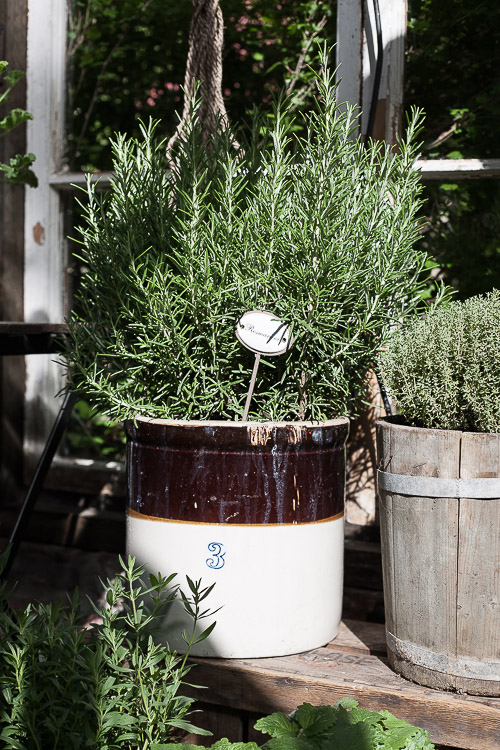 Toisen ikkunan alla on isoin löytämäni rosmariini jonka tälläsin tuollaiseen suureen kirpputorilta löytyneeseen saviruukkuun. Mielestäni siitä tuli oikein kiva just noin, vaikka alunperin meinasin sen tuohon viereiseen puukiuluun laittaa. Se oli siihen liian suuri ja kiuluun päätyi sitten timjami. Näiden lisäksi tuolla on tietty yksi tuoksupelargoni, iisoppia sekä sitruunamelissaa ja hyllykössä muratin lisäksi oregano.