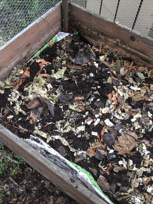 Ensimmäinen keino rikkaruohojen poiston jälkeen oli tehdä astioiden mullasta parempaa ja yhden laatikon lisukkeeksi meillä oli tarjota sille oikein erikoisherkkuna nelisen viikkoa hyvin kypsynyttä bokashi-kompostia.