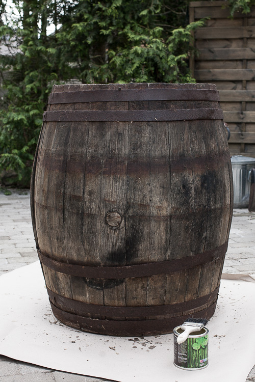 Viimeistelin tynnyrin nätiksi vielä puuöljyllä, jotta se paremmin kestää tuolla pihalla. Tämmöiseen voi hyvin käyttää myös oikeaa puutervaa tai hienompaa lämpökäsiteltyä pellavaöljyä, mutta minä ostin ensimmäistä puuöljyä mitä löysin, sillä öljysin tuosta vain nuo ulkopinnat.