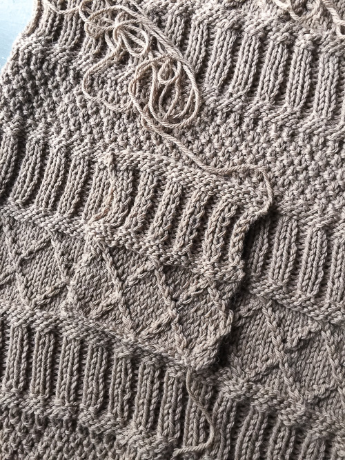 Takakappalessa tein samanlailla ja samat kavennukset kainaloista, mutta neuloin tuplahelmineuletta 44 kerrosta, ja päättelin kaula-aukkoa varten 30 ja kaventelin kummaltakin puolelta samanlailla kun etukappaleessakin, kunnes jäljellä puikoilla oli se 23 silmukkaa ja päättelin. Takakappaleesta tuli pari-kolme kerrosta korkeampi kuin etukappaleesta ihan tarkoituksella.