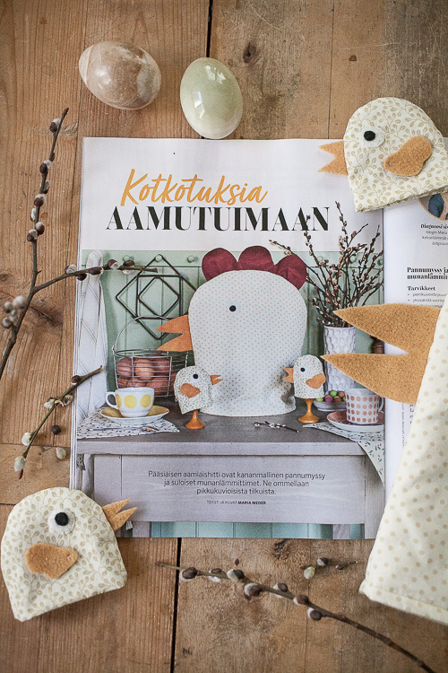 Uusimmassa Unelmien Talo&Koti-lehdessä on minun tekemäni ohje pääsiäsipöydän hyödyllisimpiin koristuksiin eli tuollaisiin hulvattoman hauskoihin kanapannumyssyn ja pikkutipuihin munanlämmittiminä. Ei ole tylsää pääsiäisen aamiaispöydässä näiden veitikoiden kanssa!
