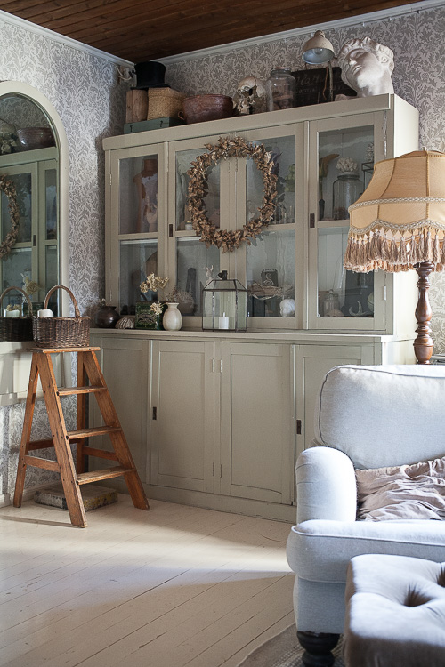 Kyllä nyt on niin kivaa, kun aurinkoisia päiviä on alkanut olla enemmän ja valon määrä tässä hämärässä rintamamiestalossa sen kun lisääntyy ja lisääntyy. Tämäkin olohuoneen vitriinikaappi on saanut olla pimeässä ja piilossa jo niin pitkään, että ilo on kyllä iso, kun sen sisälle vihdoin taas päivänvalossa näkee. Tämä on talviaikaan yksi talon pimeimpiä nurkkia, mutta tosi valoisa näin helmikuussa, kun aurinko paistelee.